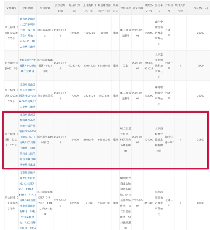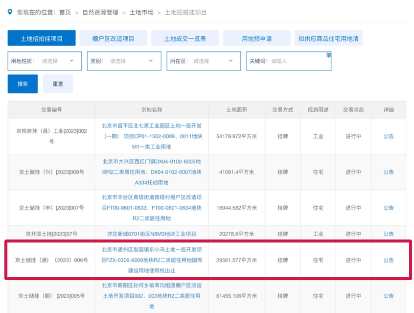 当前还有4个地块正在挂牌中,通州挂牌一个。