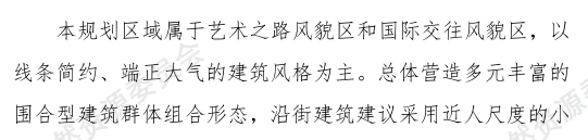 记者注意到,规划区域属于艺术之路风貌区和国际交往风貌区,以线条简约、端正大气的建筑风格为主。总体营造多元丰富的围合型建筑群体组合形态,沿街建筑建议采用近人尺度的小体量设计,并在设计中鼓励使用簇群化、围合式的建筑布局。